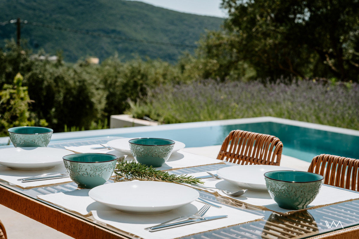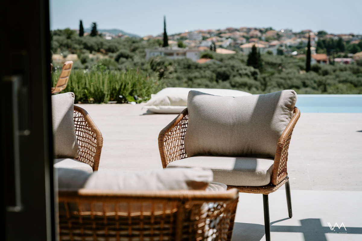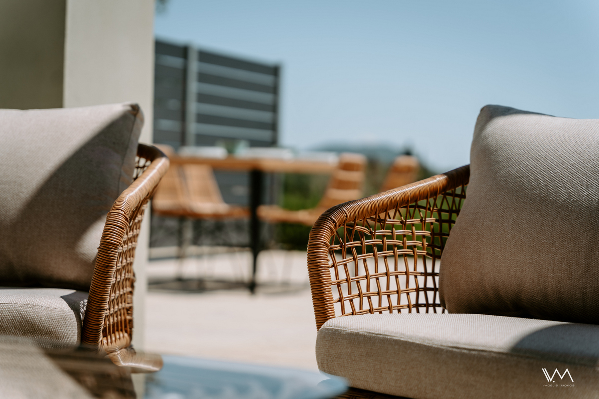 Στον εξωτερικό χώρο δίπλα στην πισίνα υπάρχουν έπιπλα κήπου, ξαπλώστρες και ομπρέλες.
